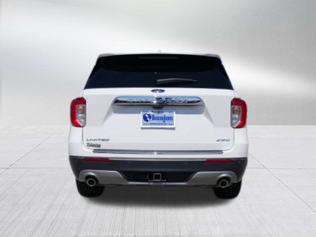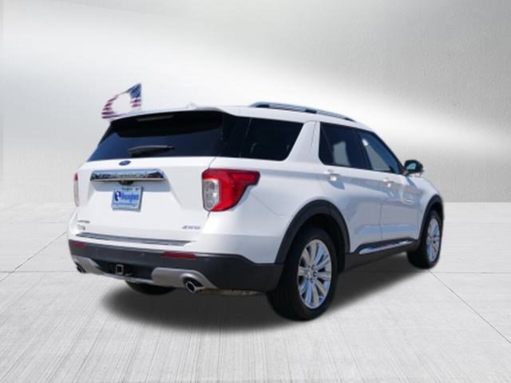 White 2021 Ford Explorer Limited 2.3L EcoBoost I-4 10-Speed Automatic 4WD Class III Trailer Tow Package, Equipment Group 301A, Limited Convenience Package (110V/150W AC Power Outlet, 3rd Row PowerFold Seat, Hands-Free Foot-Activated Liftgate, Memory Driver's Seat, Power Tilt/Telescoping Steering Column, and Sideview Mirrors w/Gloss Black Caps), 4WD, 12 Speakers, 20 Premium Painted Aluminum Wheels, 3.58 Non-Limited-Slip Rear Axle Ratio, 3rd row seats: bench, 4-Wheel Disc Brakes, ABS brakes, Air Conditioning, Alloy wheels, AM/FM radio: SiriusXM, Auto High-beam Headlights, Auto-dimming Rear-View mirror, Automatic temperature control, Brake assist, Bumpers: body-color, Compass, Delay-off headlights, Driver door bin, Driver vanity mirror, Dual front impact airbags, Dual front side impact airbags, Electronic Stability Control, Emergency communication system: SYNC 3 911 Assist, Exterior Parking Camera Rear, FordPass Connect, Four wheel independent suspension, Front anti-roll bar, Front Bucket Seats, Front Center Armrest, Front dual zone A/C, Front fog lights, Front reading lights, Fully automatic headlights, Garage door transmitter: HomeLink, Heated door mirrors, Heated front seats, Heated rear seats, Heated steering wheel, Illuminated entry, Knee airbag, Leather Heated/Ventilated Captain's Chairs, Leather steering wheel, Low tire pressure warning, Navigation System, Occupant sensing airbag, Outside temperature display, Overhead airbag, Overhead console, Panic alarm, Passenger door bin, Passenger vanity mirror, Power door mirrors, Power driver seat, Power Liftgate, Power passenger seat, Power steering, Power windows, Radio data system, Radio: B&O Sound System by Bang & Olufsen, Rain sensing wipers, Rear air conditioning, Rear anti-roll bar, Rear reading lights, Rear window defroster, Rear window wiper, Remote keyless entry, Roof rack: rails only, Security system, Speed control, Speed-sensing steering, Speed-Sensitive Wipers, Split folding rear seat, Spoiler, Steering wheel mounted audio controls, SYNC 3 Communications & Entertainment System, SYNC 3/Apple CarPlay/Android Auto, Tachometer, Telescoping steering wheel, Tilt steering wheel, Traction control, Trip computer, Turn signal indicator mirrors, Twin Panel Moonroof, Variably intermittent wipers, Ventilated front seats, Voice-Activated Touchscreen Navigation System, and Wheels: 20 10-Spoke Aluminum.