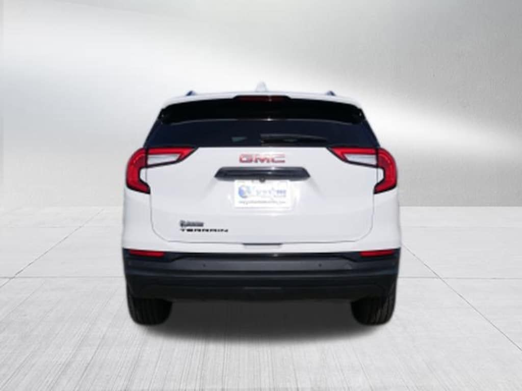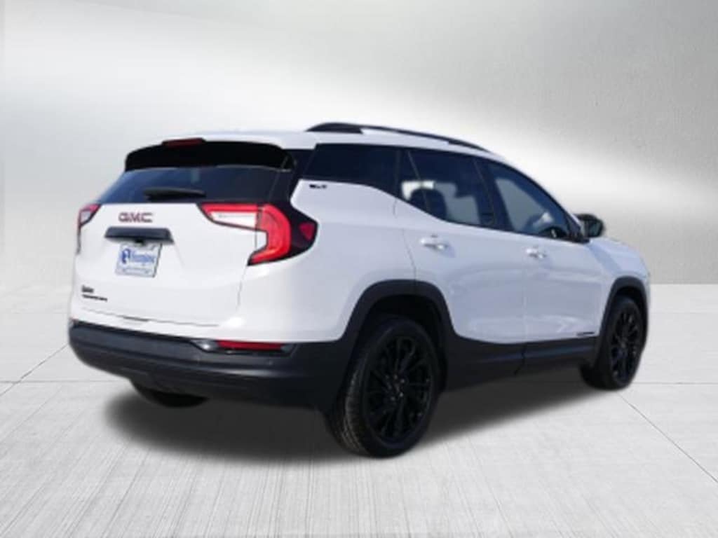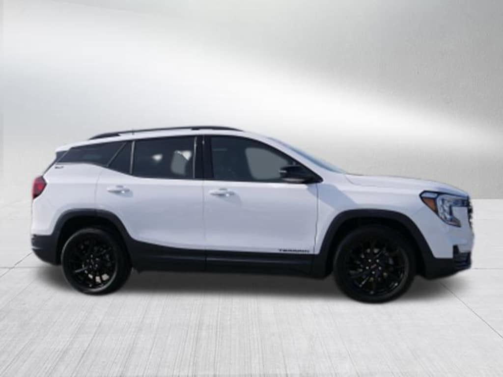 Summit White 2024 GMC Terrain SLT 1.5L DOHC 9-Speed Automatic FWD Elevation Edition (Black GMC Center Caps w/Red GMC Lettering, Black Mirror Caps, Darkened Front Grille, Roof-Mounted Luggage Rack Side Rails, and Wheels: 19 Gloss Black Aluminum), GMC Pro Safety Plus (Adaptive Cruise Control, Lane Change Alert w/Side Blind Zone Alert, Rear Cross-Traffic Alert, Rear Park Assist, and Safety Alert Seat), Preferred Equipment Group 4SA, 2 USB Data Ports, 2 USB Data Ports w/SD Card Reader, 3.47 Final Drive Axle Ratio, 4-Wheel Disc Brakes, 6 Speakers, 6-Speaker Audio System Feature, 6-Way Power Front Passenger Seat, 8-Way Power Driver Seat Adjuster, ABS brakes, Air Conditioning, Alloy wheels, AM/FM radio: SiriusXM, Auto High-beam Headlights, Auto-dimming Rear-View mirror, Automatic temperature control, Bluetooth® For Phone, Brake assist, Bumpers: body-color, Compass, Delay-off headlights, Driver & Front Passenger Heated Seats, Driver door bin, Driver vanity mirror, Dual front impact airbags, Dual front side impact airbags, Electronic Stability Control, Emergency communication system: OnStar and GMC connected services capable, Four wheel independent suspension, Front anti-roll bar, Front Bucket Seats, Front Center Armrest, Front dual zone A/C, Front fog lights, Front Passenger 2-Way Power Lumbar, Front reading lights, Fully automatic headlights, Garage door transmitter, Heated door mirrors, Heated front seats, Heated steering wheel, Illuminated entry, Low tire pressure warning, Memory seat, Occupant sensing airbag, Outside temperature display, Overhead airbag, Overhead console, Panic alarm, Passenger door bin, Passenger vanity mirror, Perforated Leather-Appointed Seat Trim, Power door mirrors, Power Driver Lumbar Control, Power driver seat, Power Liftgate, Power passenger seat, Power steering, Power windows, Radio data system, Radio: GMC Infotainment Audio System w/8 Display, Rear anti-roll bar, Rear seat center armrest, Rear window defroster, Rear window wiper, Remote keyless entry, Roof rack: rails only, Security system, SiriusXM, Skyscape Power Sunroof w/Power Sunscreen, Speed control, Speed-sensing steering, Split folding rear seat, Spoiler, Steering wheel mounted audio controls, Tachometer, Telescoping steering wheel, Tilt steering wheel, Traction control, Trip computer, Turn signal indicator mirrors, Variably intermittent wipers, Wheels: 18 x 7 Silver Painted Aluminum, and Wireless Apple CarPlay/Wireless Android Auto.