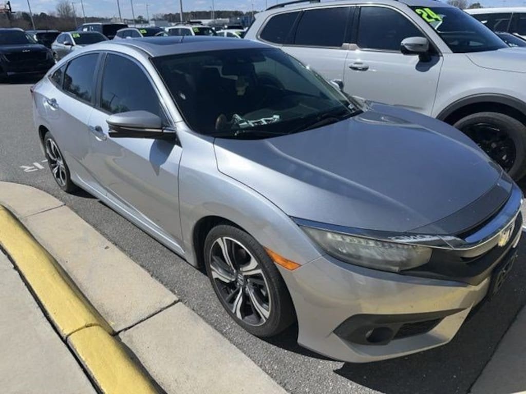 Silver 2016 Honda Civic Touring FWD CVT 1.5L I-4 DI DOHC Turbocharged Lx Leather, 10 Speakers, 17" Alloy Wheels, 4-Wheel Disc Brakes, ABS brakes, Air Conditioning, Alloy wheels, AM/FM radio: SiriusXM, Apple CarPlay/Android Auto, Auto-dimming Rear-View mirror, Automatic temperature control, Brake assist, Bumpers: body-color, Compass, Delay-off headlights, Driver door bin, Driver vanity mirror, Dual front impact airbags, Dual front side impact airbags, Electronic Stability Control, Emergency communication system: HondaLink Assist, Exterior Parking Camera Rear, Four wheel independent suspension, Front anti-roll bar, Front Bucket Seats, Front Center Armrest, Front dual zone A/C, Front fog lights, Front reading lights, Fully automatic headlights, Heated door mirrors, Heated front seats, Heated rear seats, Illuminated entry, Leather Seat Trim, Leather Shift Knob, Low tire pressure warning, Navigation System, Occupant sensing airbag, Outside temperature display, Overhead airbag, Panic alarm, Passenger door bin, Passenger vanity mirror, Power door mirrors, Power driver seat, Power moonroof, Power passenger seat, Power steering, Power windows, Radio data system, Radio: 450-Watt AM/FM/HD/SiriusXM Audio System, Rain sensing wipers, Rear anti-roll bar, Rear seat center armrest, Rear window defroster, Reclining Heated Front Bucket Seats, Remote keyless entry, Security system, Speed control, Speed-sensing steering, Speed-Sensitive Wipers, Split folding rear seat, Spoiler, Steering wheel mounted audio controls, Tachometer, Telescoping steering wheel, Tilt steering wheel, Traction control, Trip computer, Turn signal indicator mirrors, and Variably intermittent wipers.