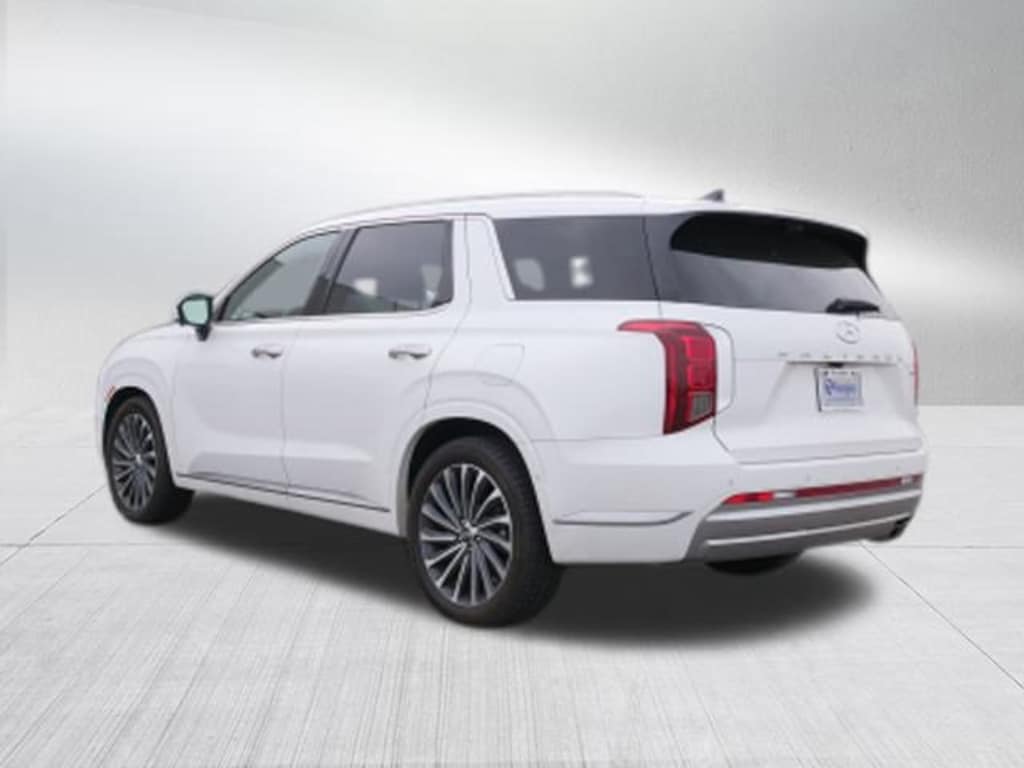 Hyper White 2023 Hyundai Palisade Calligraphy V6 8-Speed Automatic with SHIFTRONIC AWD Cargo Package (Cargo Blocks, Cargo Net, and Cargo Tray), Option Group 01, 12 Speakers, 3.648 Axle Ratio, 3rd row seats: split-bench, 4-Wheel Disc Brakes, ABS brakes, Air Conditioning, Alloy wheels, AM/FM radio: SiriusXM, Apple CarPlay & Android Auto, Auto High-beam Headlights, Auto-dimming door mirrors, Auto-dimming Rear-View mirror, Auto-leveling suspension, Automatic temperature control, Brake assist, Bumpers: body-color, Cargo Cover/Screen, Carpeted Floor Mats, Compass, Delay-off headlights, Driver door bin, Driver vanity mirror, Dual front impact airbags, Dual front side impact airbags, Electronic Stability Control, Emergency communication system: Blue Link Connected Car Service (3-year complimentary subscription), Exterior Parking Camera Rear, First Aid Kit, Four wheel independent suspension, Front anti-roll bar, Front Bucket Seats, Front Center Armrest, Front dual zone A/C, Front reading lights, Fully automatic headlights, Garage door transmitter: HomeLink, harman/kardon® Speakers, Heads-Up Display, Heated & Ventilated Front Bucket Seats, Heated door mirrors, Heated front seats, Heated rear seats, Heated steering wheel, Illuminated entry, Knee airbag, Low tire pressure warning, Memory seat, Navigation System, Occupant sensing airbag, Outside temperature display, Overhead airbag, Overhead console, Panic alarm, Passenger door bin, Passenger vanity mirror, Power door mirrors, Power driver seat, Power Liftgate, Power moonroof, Power passenger seat, Power steering, Power windows, Premium Nappa Leather Seat Trim, Radio data system, Radio: AM/FM/MP3 Premium Audio System, Rain sensing wipers, Rear air conditioning, Rear anti-roll bar, Rear audio controls, Rear reading lights, Rear side impact airbag, Rear window defroster, Rear window wiper, Reclining 3rd row seat, Remote keyless entry, Security system, Speed control, Speed-sensing steering, Split folding rear seat, Spoiler, Steering wheel mounted audio controls, Tachometer, Telescoping steering wheel, Tilt steering wheel, Traction control, Trip computer, Turn signal indicator mirrors, Variably intermittent wipers, Ventilated front seats, Ventilated rear seats, Wheel Locks, and Wheels: 20 x 7.5J Calligraphy Exclusive Alloy.
