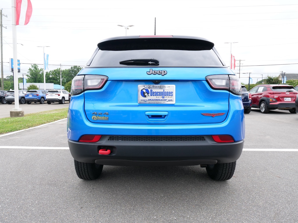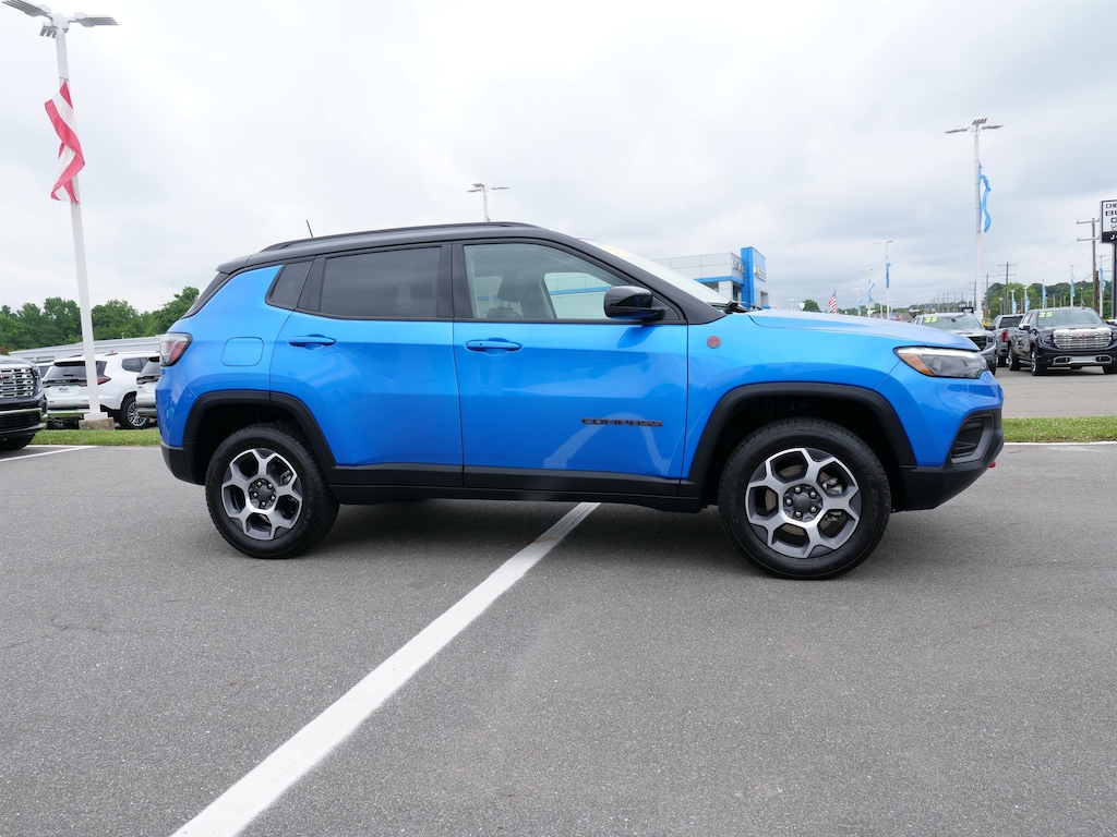 Laser Blue Pearlcoat 2022 Jeep Compass Trailhawk 2.4L I4 9-Speed 948TE Automatic 4WD Quick Order Package 2GE, Trailhawk Elite Group (10.1 Touchscreen Display, 115V Auxiliary Power Outlet, 2nd Row Heated Seats, 2nd Row USB Type A/C Charge Only, 4G LTE Wi-Fi Hot Spot, Alexa Built-In, Cluster 10.25 TFT Color Display, Connected Travel & Traffic Services, Disassociated Touchscreen Display, Driver Seat Memory, Foot Activated Open 'N Go Liftgate, For Details, Visit DriveUconnect.com, For More Info, Call 800-643-2112, Global Telematics Box Module (TBM), GPS Navigation, HD Radio, Heated Front Seats, Integrated Voice Command w/Bluetooth, Leather Wrapped Steering Wheel, LED Low/Highbeam Projector Headlamps, No Satellite Coverage HI/AK/PR/VI/GU, Power 8-Way Adjust Front Passenger Seat, Power Adjust 8-Way Driver Seat, Power Liftgate, Premium Leather Trimmed Bucket Seats, Premium LED Fog Lamps, Premium Taillamps, Radio: Uconnect 5 Nav w/10.1 Display, Remote Start System, Reversible Carpet/Vinyl Cargo Mat, SiriusXM Guardian - Included Trial (B), SiriusXM Radio Service, SiriusXM Satellite Radio, SiriusXM w/360L, Vehicle Information Center, Ventilated Front Seats, and Windshield Wiper De-Icer), 4WD, 4-Wheel Disc Brakes, 4.334 Axle Ratio, 6 Speakers, ABS brakes, Air Conditioning, Alloy wheels, AM/FM radio: SiriusXM, Anti-whiplash front head restraints, Auto High-beam Headlights, Auto-dimming Rear-View mirror, Automatic temperature control, Brake assist, Bumpers: body-color, Compass, Delay-off headlights, Driver door bin, Driver vanity mirror, Dual front impact airbags, Dual front side impact airbags, Electronic Stability Control, Emergency communication system: SiriusXM Guardian, Four wheel independent suspension, Front anti-roll bar, Front Bucket Seats, Front Center Armrest w/Storage, Front dual zone A/C, Front fog lights, Front reading lights, Fully automatic headlights, Heated door mirrors, Illuminated entry, Knee airbag, Leather Shift Knob, Low tire pressure warning, Occupant sensing airbag, Outside temperature display, Overhead airbag, Overhead console, Panic alarm, ParkView Rear Back-Up Camera, Passenger door bin, Passenger vanity mirror, Power door mirrors, Power steering, Power windows, Premium Cloth/Leather Trim Bucket Seats, Radio: Uconnect 5 w/10.1 Display, Rain sensing wipers, Rear anti-roll bar, Rear seat center armrest, Rear window defroster, Rear window wiper, Remote keyless entry, Roof rack: rails only, Security system, Speed control, Split folding rear seat, Spoiler, Steering wheel mounted audio controls, Tachometer, Telescoping steering wheel, Tilt steering wheel, Traction control, Trip computer, Turn signal indicator mirrors, Variably intermittent wipers, and Wheels: 17 x 6.5 Painted Diamond Cut AluminuM.