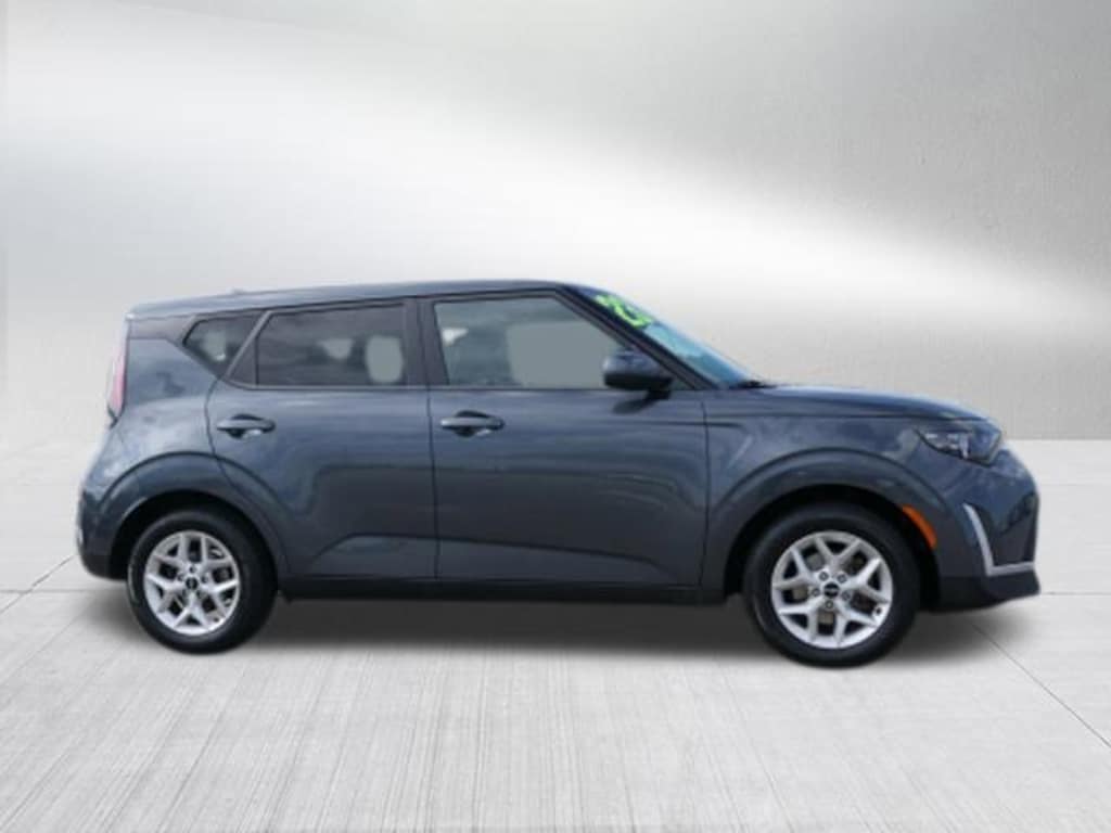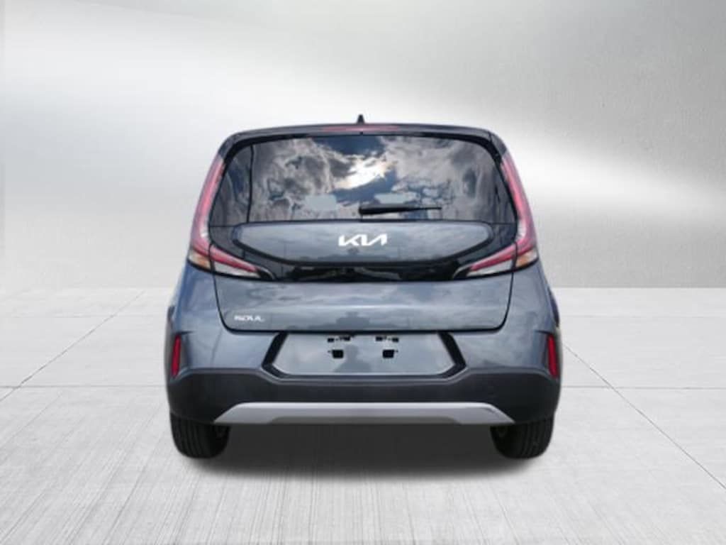 Gravity Gray 2023 Kia Soul LX FWD CVT 2.0L I4 DOHC LX Technology Package (16" Alloy Wheels, Blind-Spot Collision-Avoidance Assist, Lane Change Assist, and Rear Cross-Traffic Collision Avoidance Assist), 16" Steel Wheels, 4-Wheel Disc Brakes, 6 Speakers, ABS brakes, Air Conditioning, AM/FM radio, Apple CarPlay & Android Auto, Auto High-beam Headlights, Brake assist, Bumpers: body-color, Carpeted Floor Mats, Compass, Delay-off headlights, Driver door bin, Driver vanity mirror, Dual front impact airbags, Dual front side impact airbags, Electronic Stability Control, Exterior Parking Camera Rear, Front anti-roll bar, Front Bucket Seats, Front Center Armrest, Front reading lights, Front wheel independent suspension, Fully automatic headlights, Illuminated entry, Low tire pressure warning, Occupant sensing airbag, Outside temperature display, Overhead airbag, Overhead console, Panic alarm, Passenger door bin, Passenger vanity mirror, Power door mirrors, Power steering, Power windows, Radio data system, Radio: AM/FM/MP3/HD Audio System, Rear window defroster, Rear window wiper, Remote keyless entry, Speed control, Speed-sensing steering, Split folding rear seat, Steering wheel mounted audio controls, Tachometer, Telescoping steering wheel, Tilt steering wheel, Traction control, Trip computer, Variably intermittent wipers, and Woven & Tricot Cloth Seat Trim.