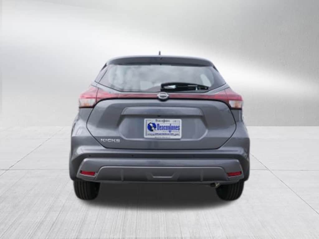 Gun Metallic 2025 Nissan Kicks Play S 1.6L 4-Cylinder DOHC 16V CVT FWD 16 Steel Wheels with Full Covers, 6 Speakers, ABS brakes, Air Conditioning, AM/FM Audio System, AM/FM radio, Apple CarPlay/Android Auto, Auto High-beam Headlights, Blind Spot Warning, Brake assist, Bumpers: body-color, Carpeted Floor Mats with Cargo Mat, Center Armrest with Storage, Cloth Seat Trim with Single Stitch, Driver door bin, Driver vanity mirror, Driver's Seat Mounted Armrest, Dual front impact airbags, Dual front side impact airbags, Electronic Stability Control, Front anti-roll bar, Front Bucket Seats, Front reading lights, Front wheel independent suspension, Fully automatic headlights, Illuminated entry, Knee airbag, Low tire pressure warning, Occupant sensing airbag, Outside temperature display, Overhead airbag, Panic alarm, Passenger door bin, Passenger vanity mirror, Power door mirrors, Power steering, Power windows, Radio data system, Rear Parking Sensors, Rear reading lights, Rear side impact airbag, Rear window defroster, Rear window wiper, Remote keyless entry, Speed control, Splash Guards Grain (4 Piece), Split folding rear seat, Sport steering wheel, Steering wheel mounted audio controls, Tachometer, Telescoping steering wheel, Tilt steering wheel, Traction control, Trip computer, and Variably intermittent wipers.