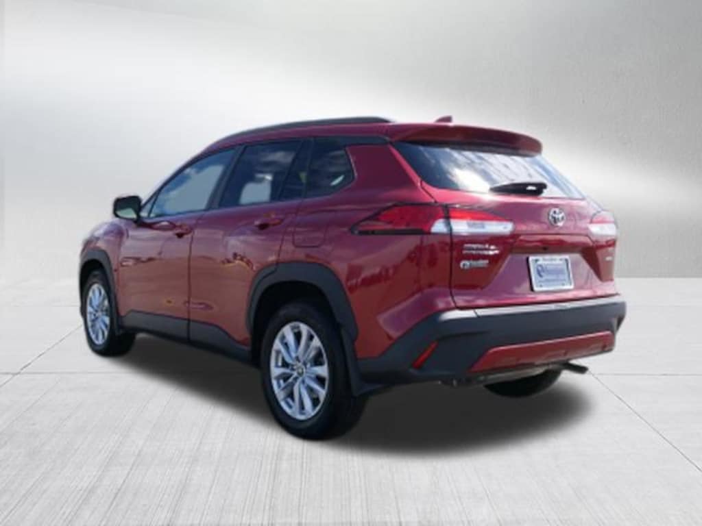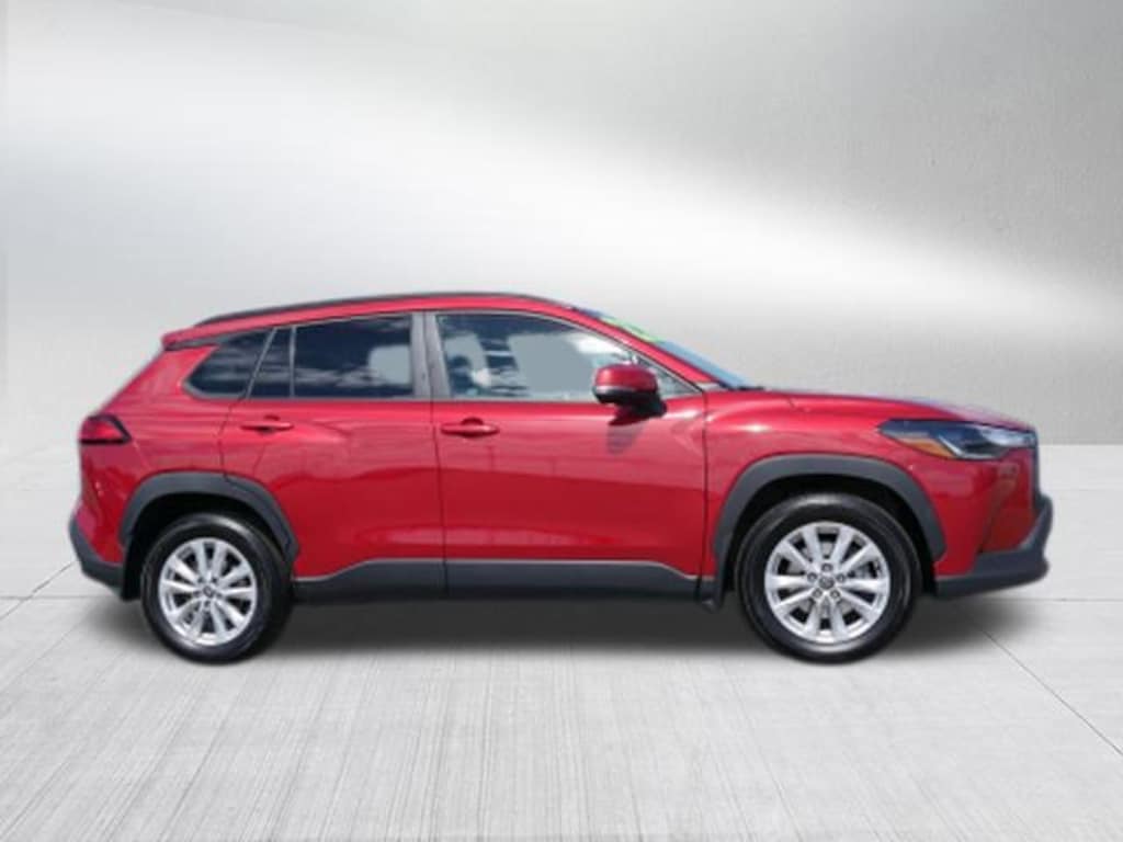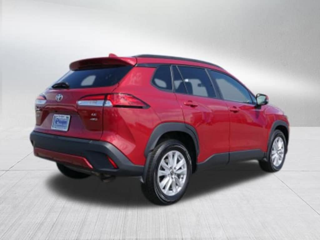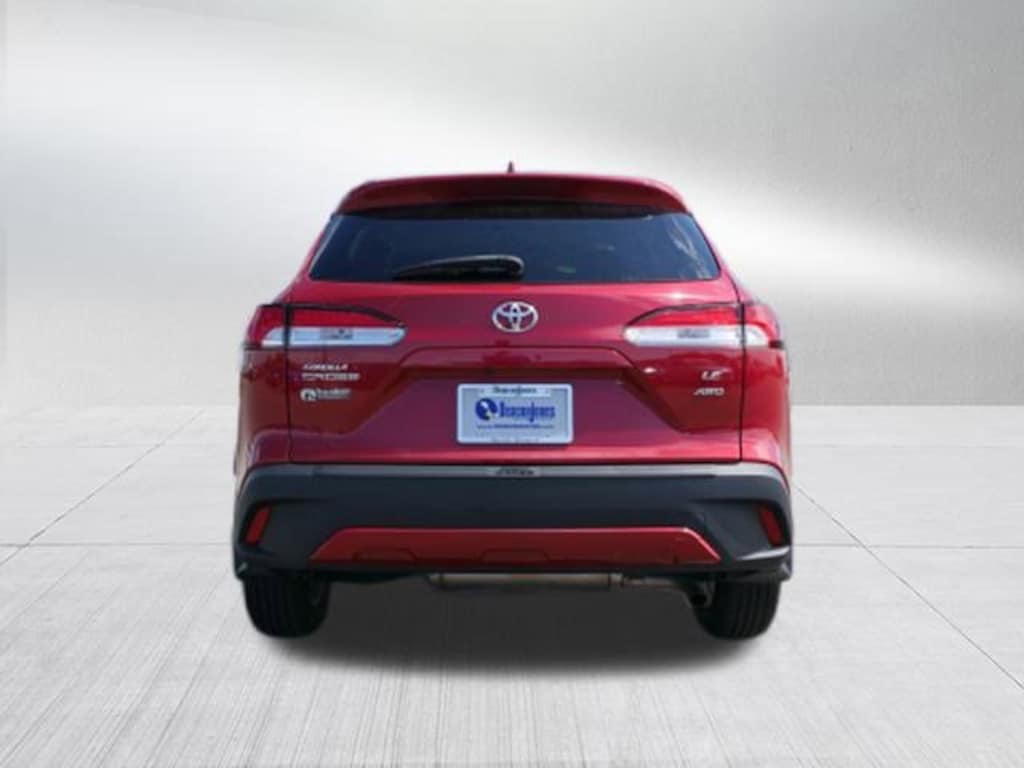 Red 2022 Toyota Corolla Cross LE 2.0L I4 PDI DOHC 16V LEV3-SULEV30 169hp CVT AWD 17 Alloy Wheels, 4-Wheel Disc Brakes, 4.014 Axle Ratio, 6 Speakers, ABS brakes, Air Conditioning, Alloy wheels, AM/FM radio: SiriusXM, Apple CarPlay/Android Auto, Auto High-beam Headlights, Automatic temperature control, Brake assist, Bumpers: body-color, Delay-off headlights, Driver door bin, Driver vanity mirror, Dual front impact airbags, Dual front side impact airbags, Electronic Stability Control, Emergency communication system: Safety Connect with 1-year trial, Exterior Parking Camera Rear, Fabric Seat Trim, Four wheel independent suspension, Front anti-roll bar, Front Bucket Seats, Front Center Armrest, Front reading lights, Fully automatic headlights, Heated door mirrors, Illuminated entry, Knee airbag, Leather steering wheel, Low tire pressure warning, Occupant sensing airbag, Outside temperature display, Overhead airbag, Panic alarm, Passenger door bin, Passenger vanity mirror, Power door mirrors, Power steering, Power windows, Radio data system, Radio: 6 Speaker Audio, Rear anti-roll bar, Rear side impact airbag, Rear window defroster, Rear window wiper, Remote keyless entry, Roof rack: rails only, Security system, Speed control, Split folding rear seat, Spoiler, Steering wheel mounted audio controls, Tachometer, Telescoping steering wheel, Tilt steering wheel, Traction control, Trip computer, Turn signal indicator mirrors, and Variably intermittent wipers.