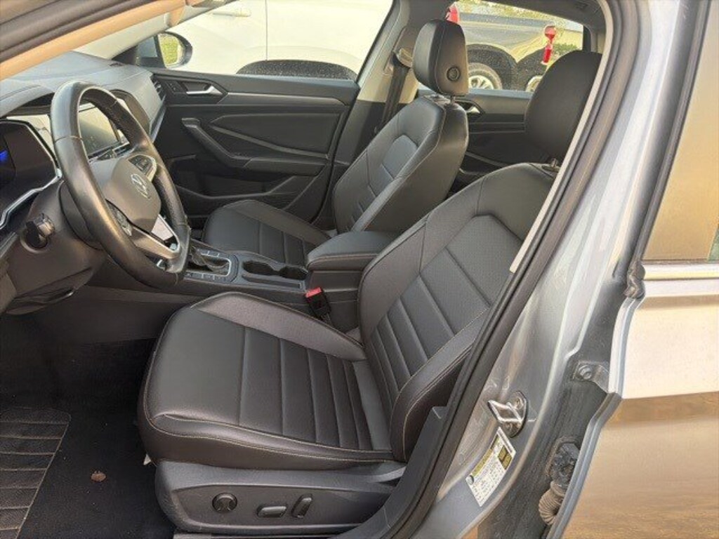 Gray 2024 Volkswagen Jetta 1.5T SE 1.5L I-4 DI DOHC Turbocharged 8-Speed Automatic with Tiptronic FWD 4 Speakers, 4-Wheel Disc Brakes, ABS brakes, Active Blind Spot Monitor, Air Conditioning, Alloy wheels, Auto-dimming Rear-View mirror, Automatic temperature control, Brake assist, Bumpers: body-color, Delay-off headlights, Driver door bin, Driver vanity mirror, Dual front impact airbags, Dual front side impact airbags, Electronic Stability Control, Emergency communication system: VW Car-Net Safe & Secure 5-year, Exterior Parking Camera Rear, Front anti-roll bar, Front Bucket Seats, Front Center Armrest, Front dual zone A/C, Front wheel independent suspension, Fully automatic headlights, Heated door mirrors, Heated Front Seats, Heated front seats, Illuminated entry, Leather Shift Knob, Leather steering wheel, Low tire pressure warning, Occupant sensing airbag, Outside temperature display, Overhead airbag, Overhead console, Panic alarm, Passenger door bin, Passenger vanity mirror, Power door mirrors, Power driver seat, Power steering, Power windows, Radio data system, Radio: MIB3 Composition Color w/6.5 Touchscreen, Rain sensing wipers, Rear anti-roll bar, Rear reading lights, Rear seat center armrest, Rear window defroster, Remote keyless entry, Speed control, Speed-sensing steering, Split folding rear seat, Steering wheel mounted audio controls, Tachometer, Telescoping steering wheel, Tilt steering wheel, Traction control, Trip computer, V-Tex Leatherette Seat Trim, Variably intermittent wipers, and Wheels: 17 Twin 5-Spoke Silver Painted Alloy.